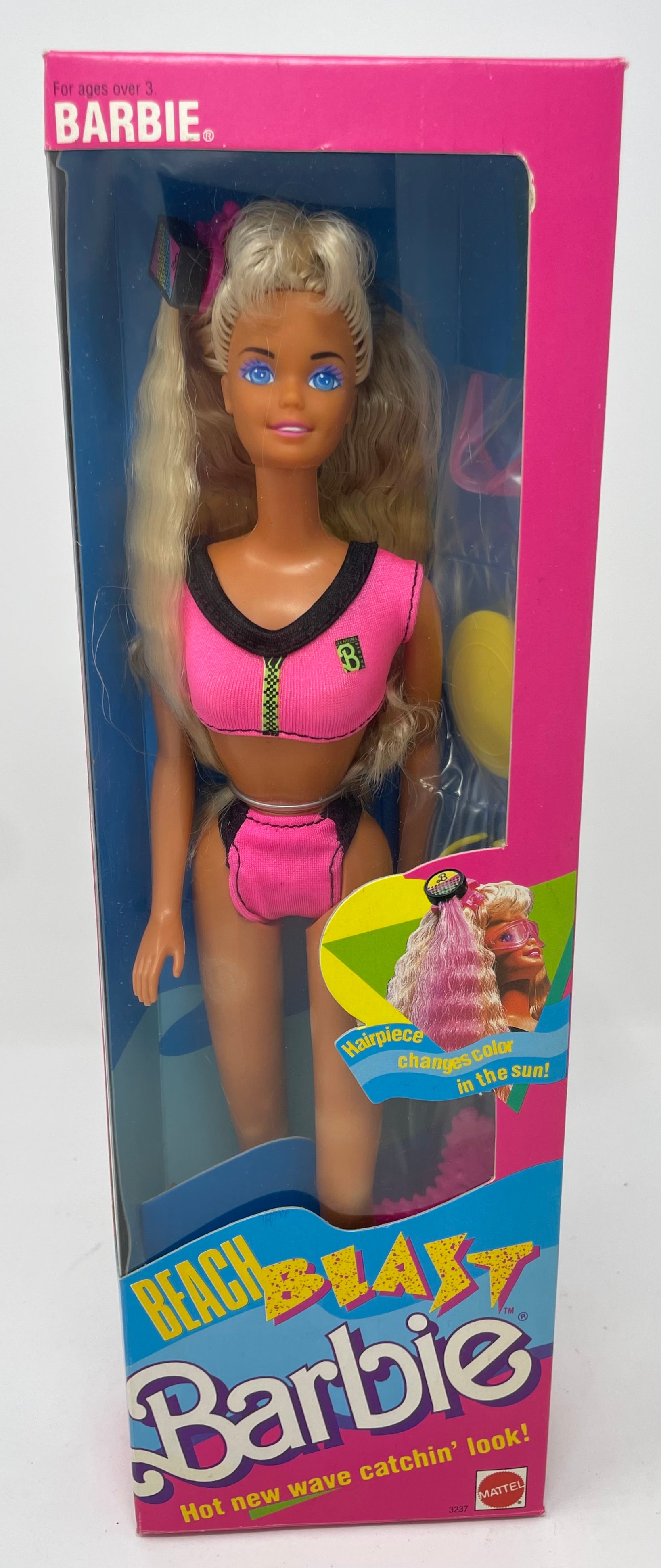 Beach Blast Barbie has a Hot New Wave Catching Look! Comes with hairpiece changes color in the sun! Also bathing suit, sunglasses, comb, flying disc, and visor.