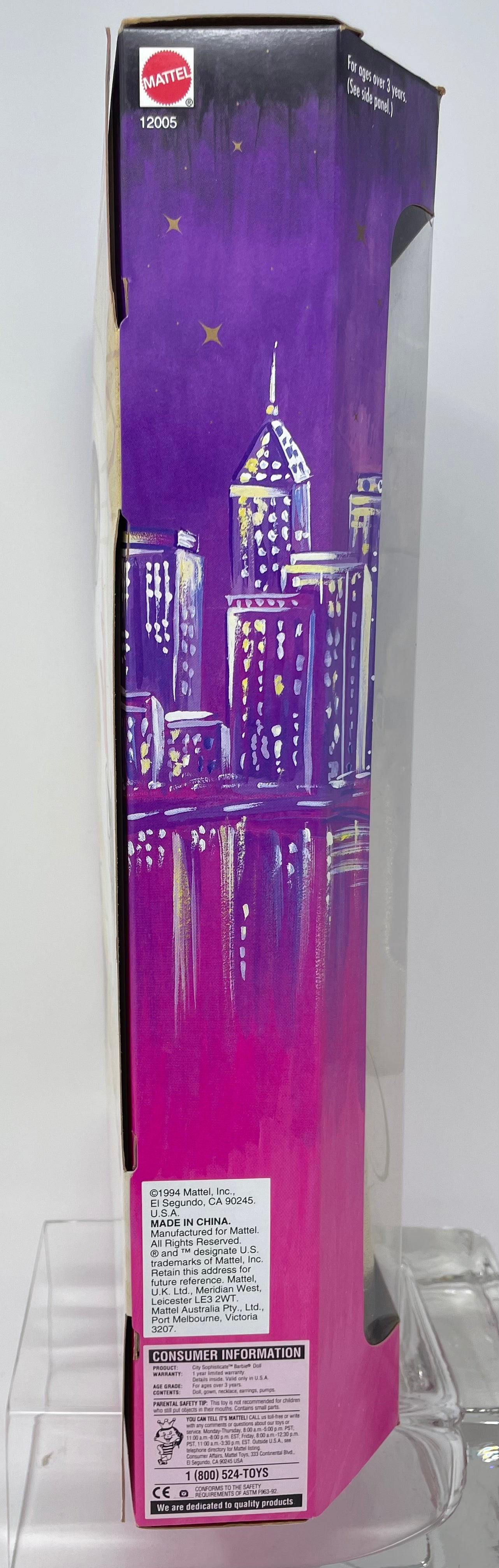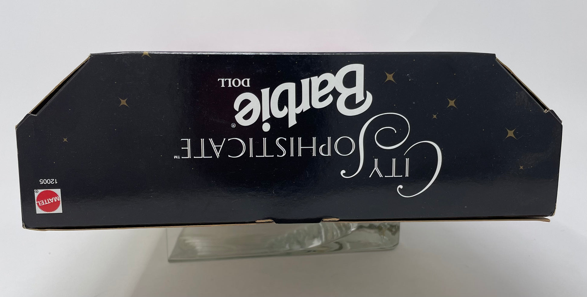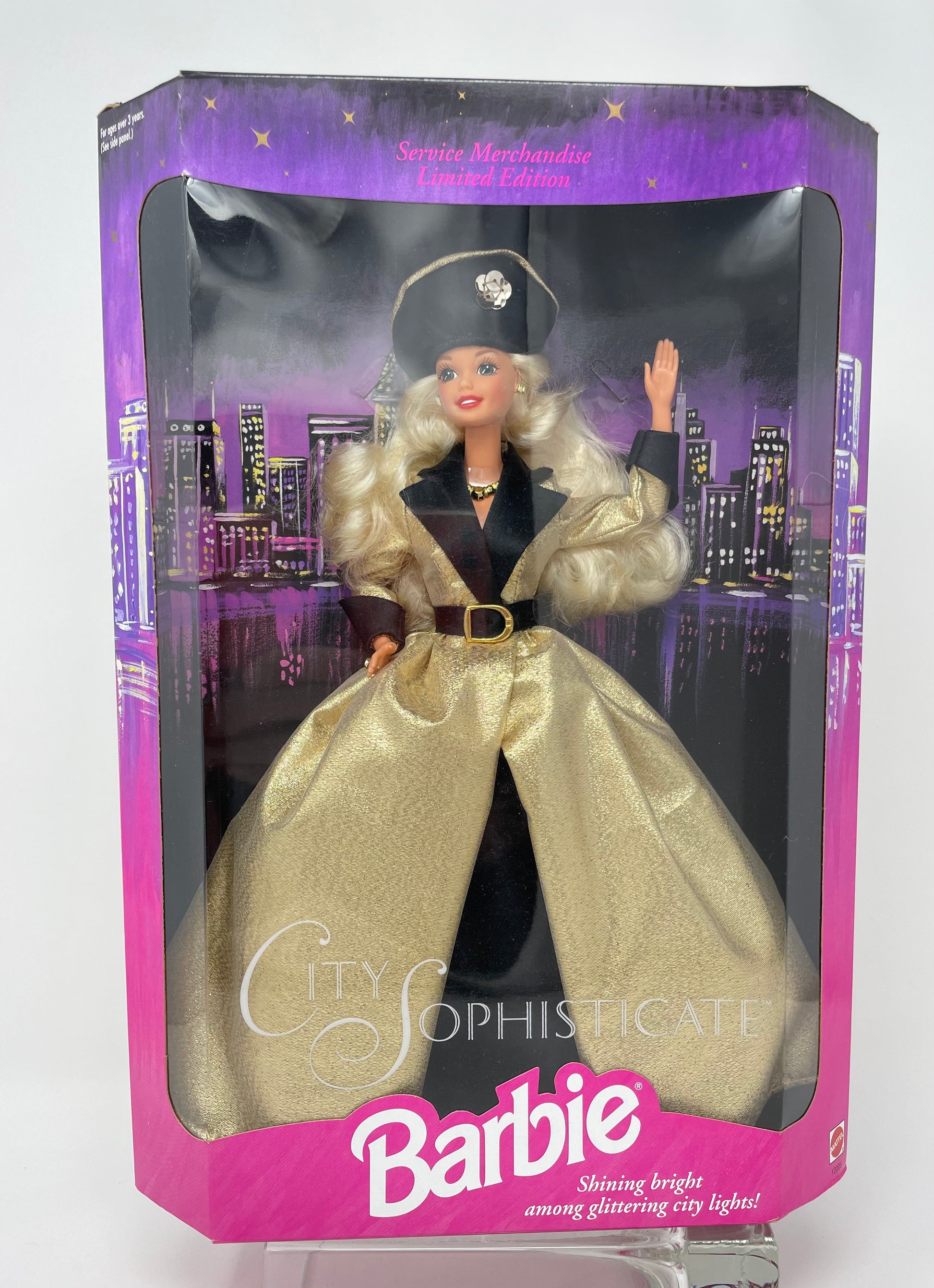 This 1994 City Sophisticate finds Barbie shining bright among glittering city lights! Dressed in dramatic black and gold from head to toe topped by an ultra sophisticated hat..