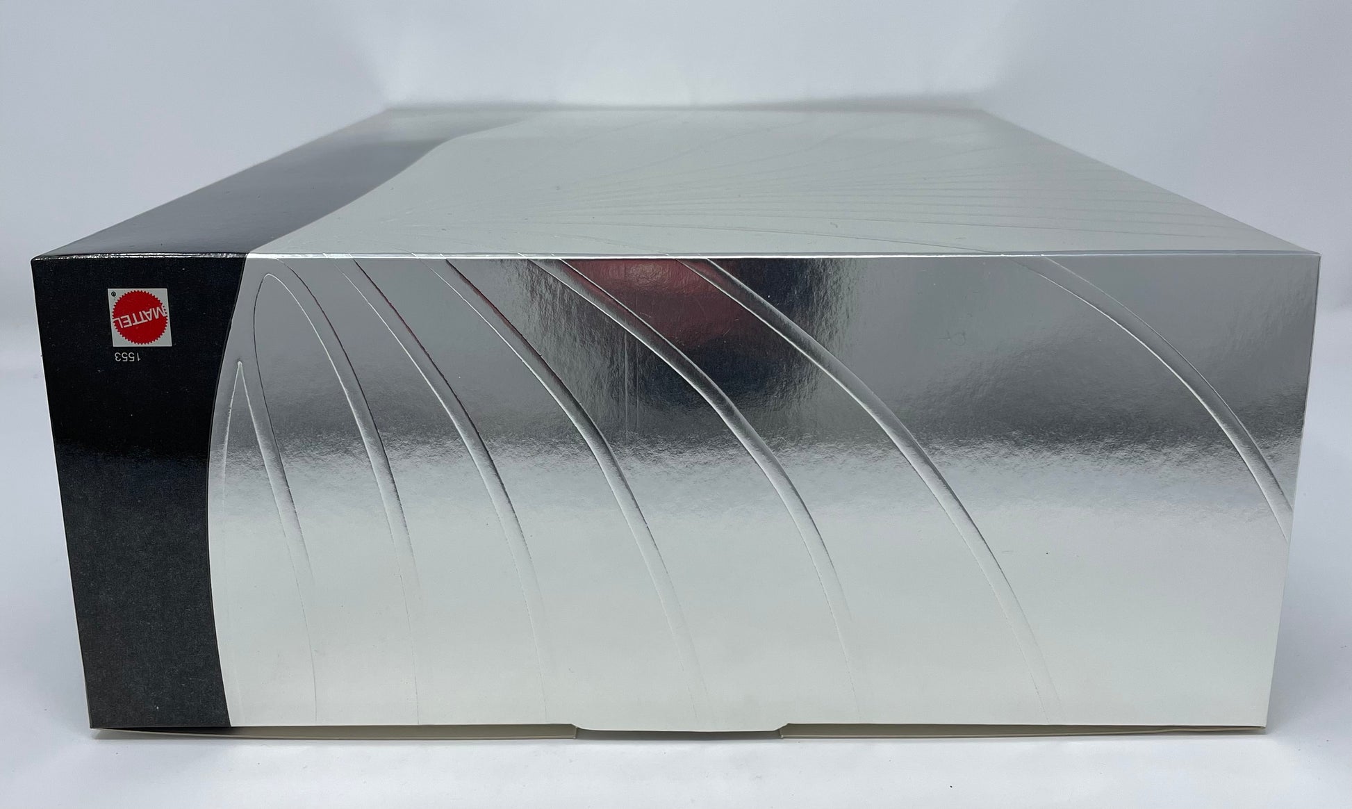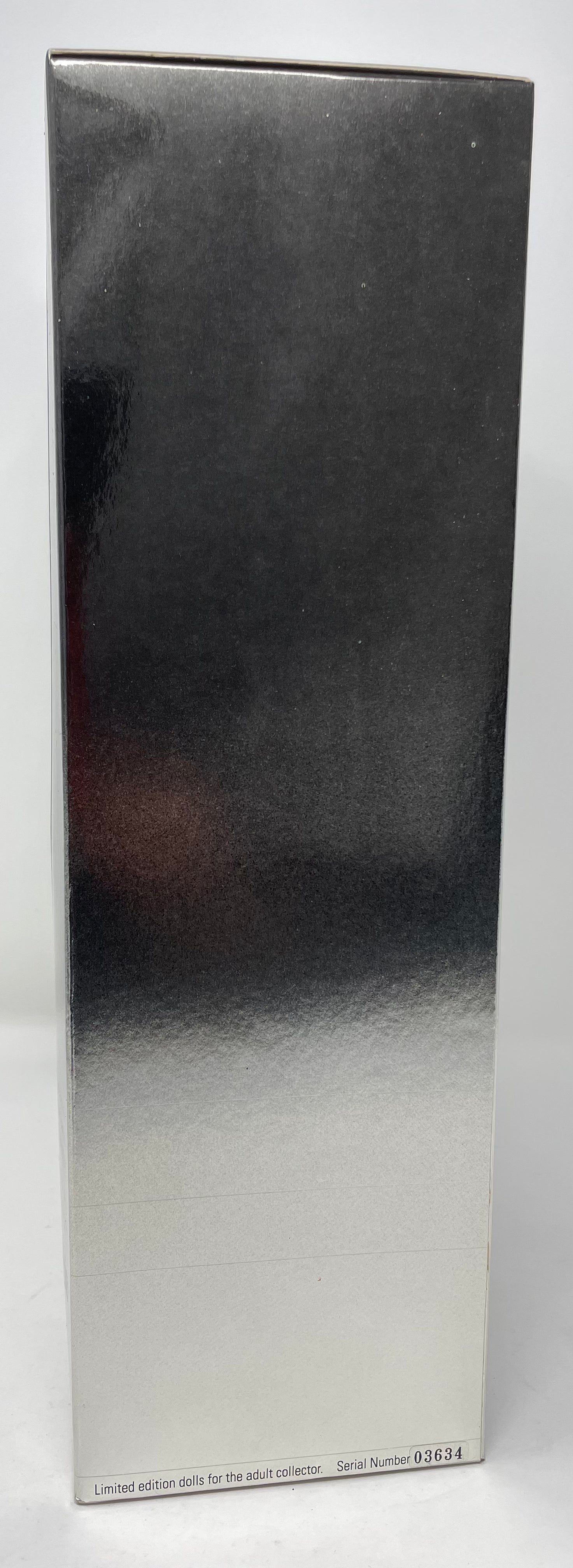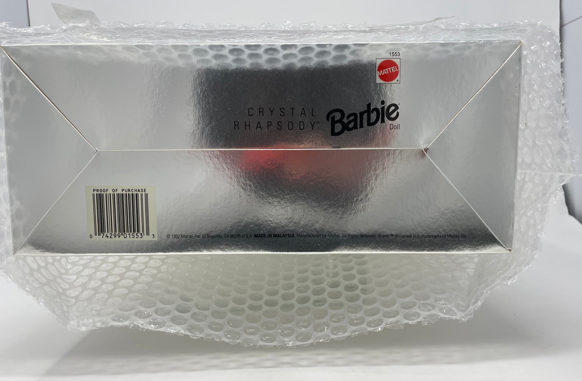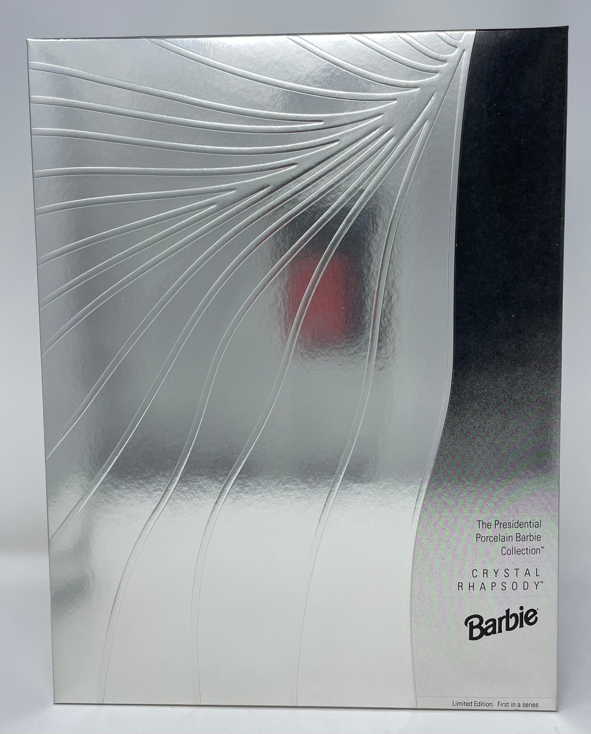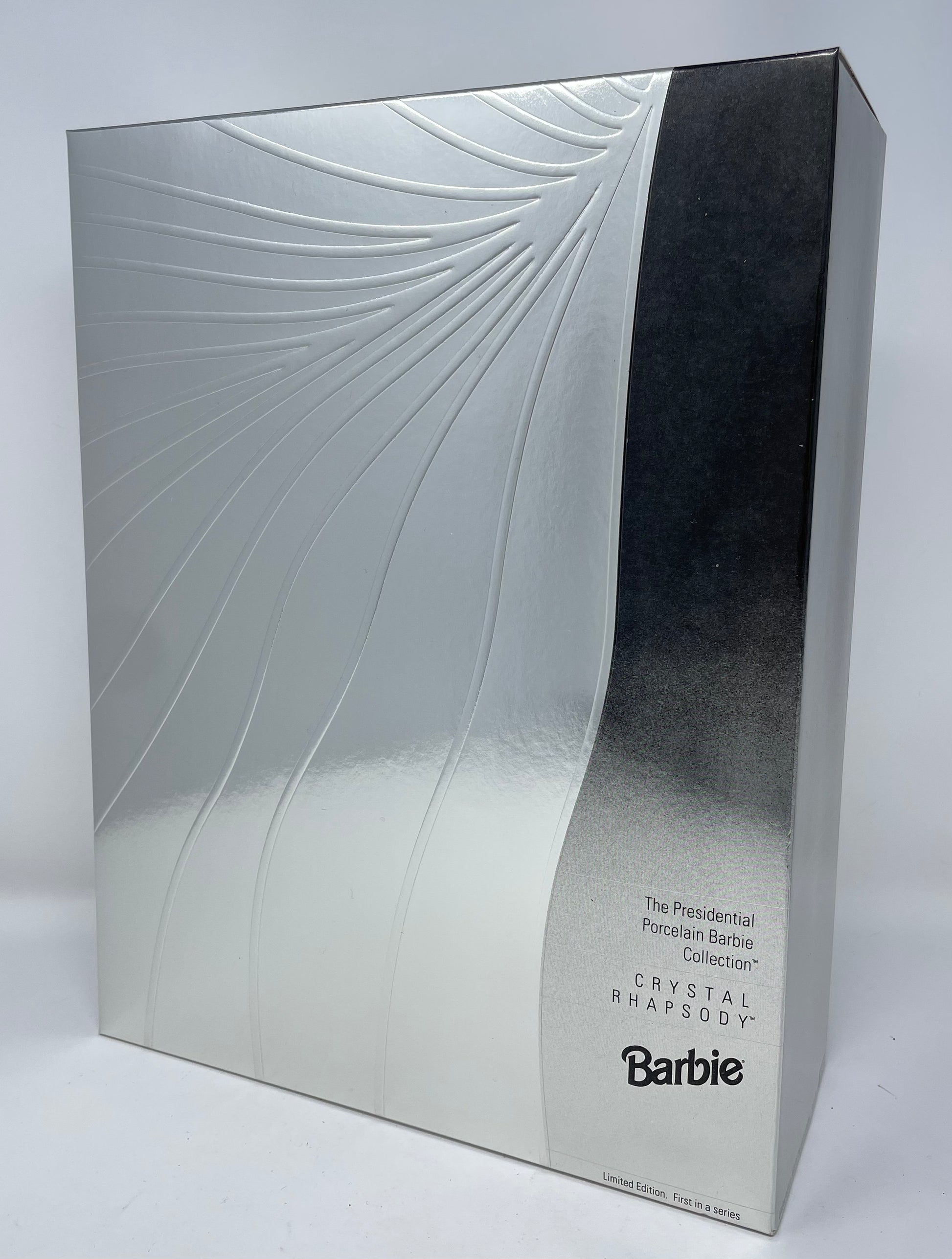 This Crystal Rhapsody Barbie was the first Barbie doll ever offered by mail order. Still in the original and intact shipping box from Mattel. This was the first in the Presidential Porcelain Collection Series and comes complete with serial number & Certificate of Authenticity. Barbie wears a black skirt and has a fabulous white pleated satin crepe coat featuring 75 Swarovski Austrian crystal rhinestones.