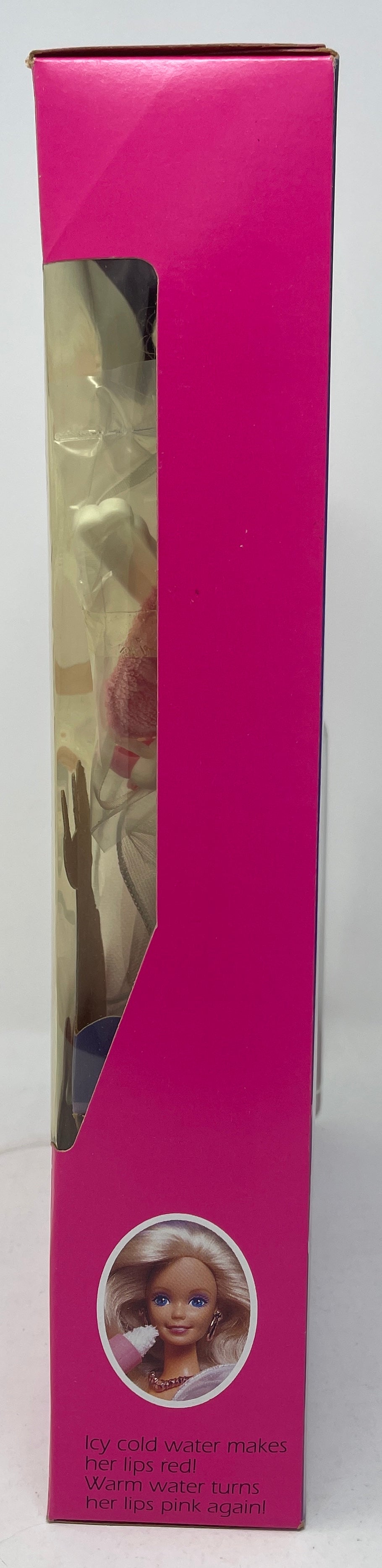 Change her lip color with water! Dress changes from ballgown to ballet to disco! Includes: ballet dress, change-around long skirt, boa, fan, panties, dress shoes, ballet shoes, necklace, earrings, ring, applicator, washcloth, hairbrush, doll stand cutout, poster and instructions.
