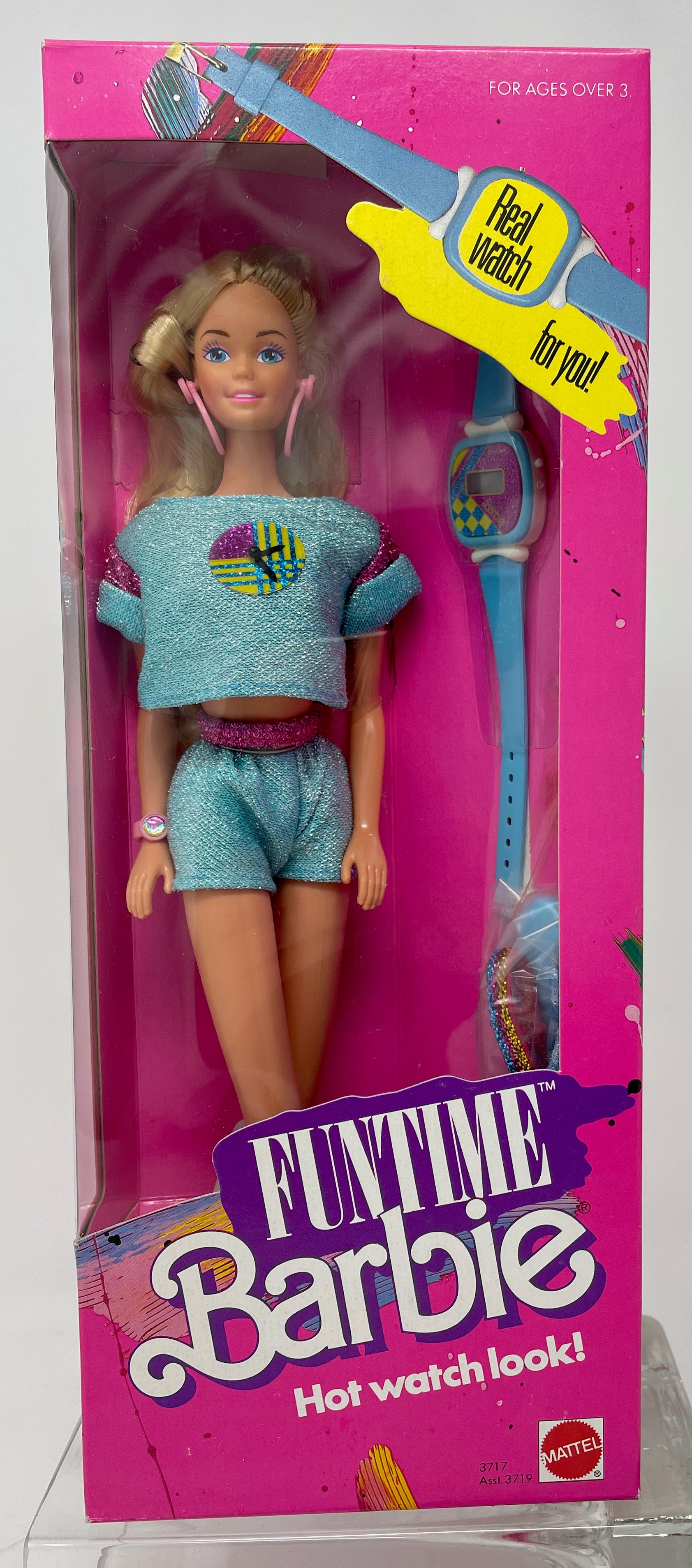 Funtime Barbie wears a crop top and sparkly shorts. Her top has a round vinyl and plastic “clock“ with hands printed on it. You can move the plastic circle as if the clock were changing time. She also comes with translucent plastic sunglasses, large round pink earrings with Clock sticker, sparkly headband, and her own pink watch so Barbee always knows what time it is. Funtime Barbee also comes with tennis shoes and checkered socks that complement her 80s look. She also brings a hairbrush so you can style her beautiful, blonde hair and a fun way But the best thing that fun time brings is a real child size watch included.