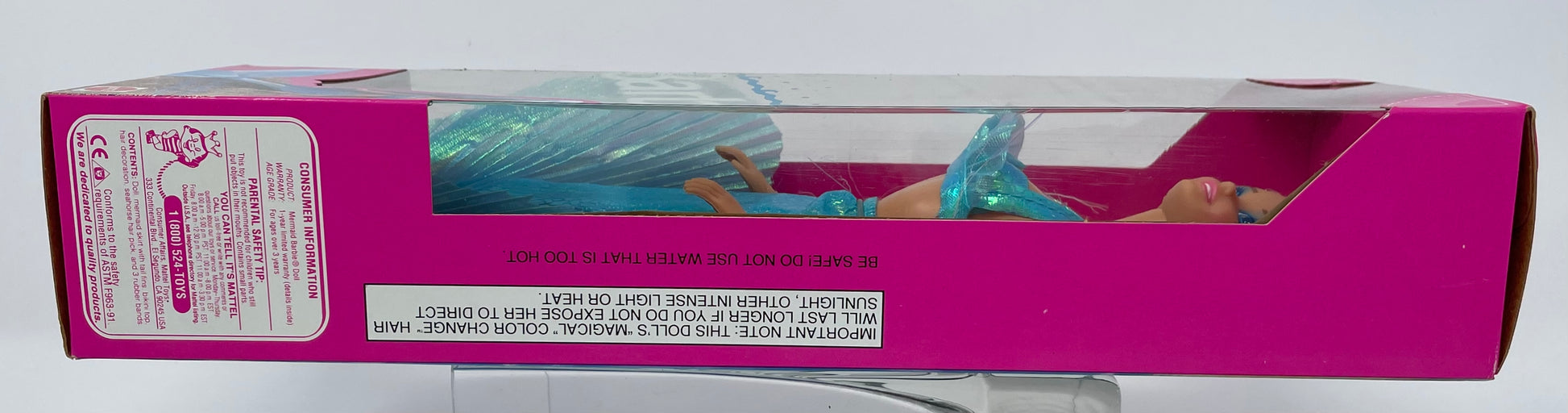 Mermaid Barbie wears a beautiful blue Mermaid outfit, hair bow and earrings. Icy water turns her hair a rainbow of colors! Warm water turns it blonde again! She's a magical mermaid!