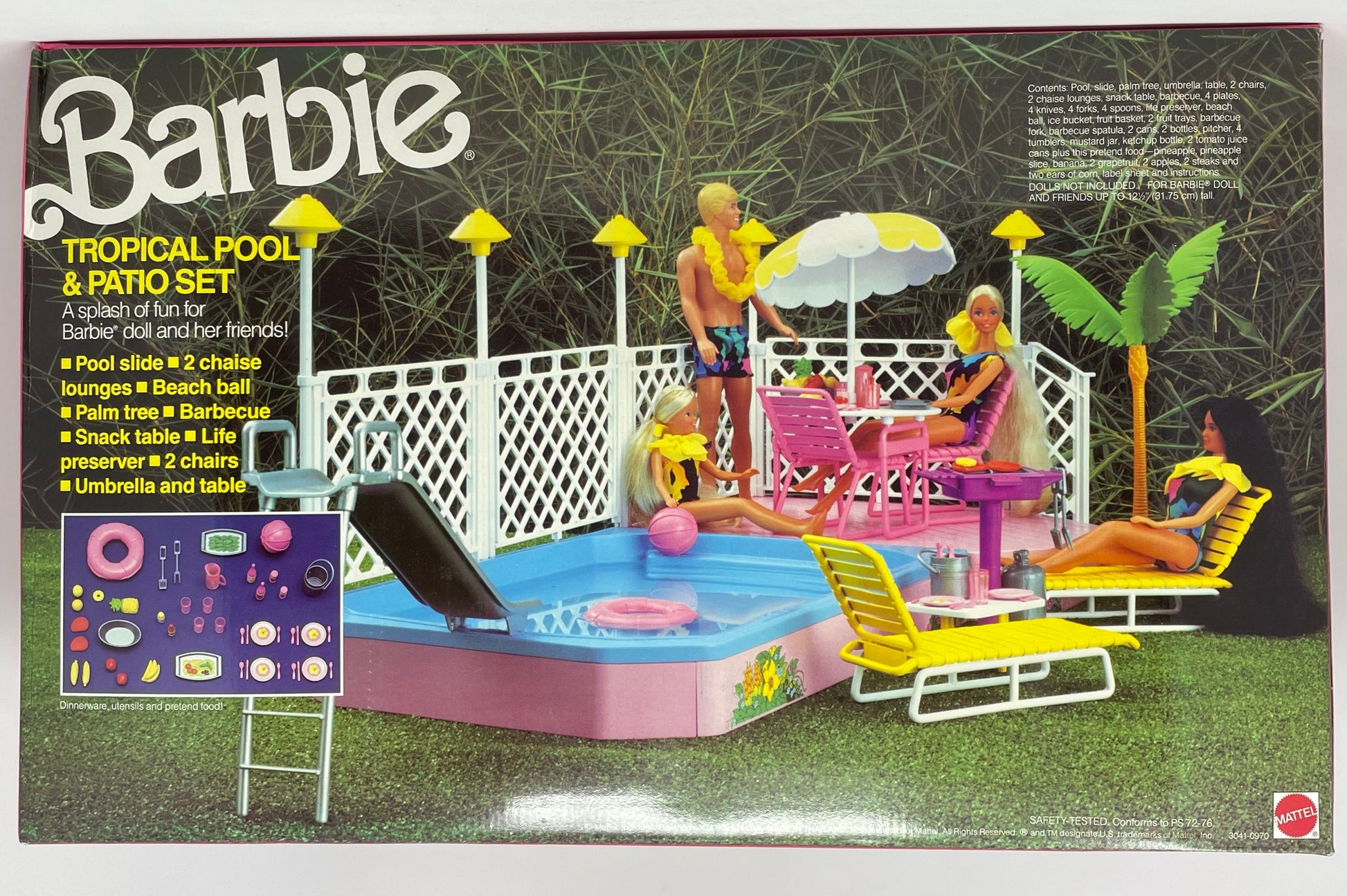 the ultimate poolside barbecue party! Comes with pool slide, chaise lounges, beach ball, palm tree, barbecue, snack table, life preserver, chairs, umbrella and table, plates. knives, spoons, trays, cups, pitcher, pail, drinks, fruit, mustard, ketchup, pretend food, barbecue utensils, pool, fencing. Doll